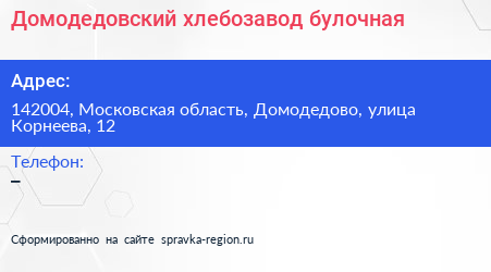 Домодедовский хлебозавод, булочная по адресу 142004, Московская область, Домодедово, улица Корнеева, 12 в дальнейшем Организация, размещена в следующих категориях: