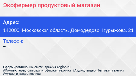 Экофермер, продуктовый магазин по адресу 142000, Московская область, Домодедово, Курыжова, 21 в дальнейшем Организация, размещена в следующих категориях: