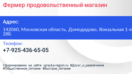 Фермер, продовольственный магазин по адресу 142060, Московская область, Домодедово, Вокзальная 1-я, 28Б в дальнейшем Организация, размещена в следующих категориях:
