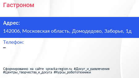 Гастроном по адресу 142006, Московская область, Домодедово, Заборье, 1д в дальнейшем Организация, размещена в следующих категориях: