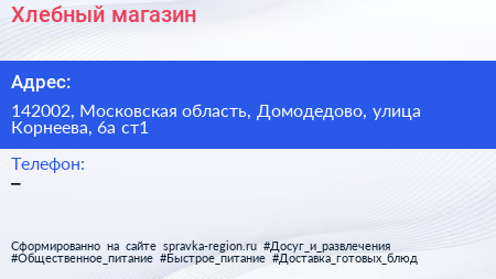 Хлебный магазин по адресу 142002, Московская область, Домодедово, улица Корнеева, 6а ст1 в дальнейшем Организация, размещена в следующих категориях: