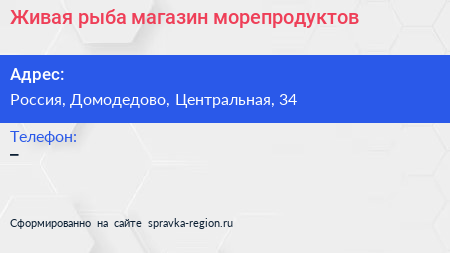 Живая рыба, магазин морепродуктов по адресу 34, Центральная улица, посёлок Государственного Племенного Завода "Константиново", городской округ Домодедово, Московская область, Центральный федеральный округ, 142029, Россия в дальнейшем Организация, размещена в следующих категориях: