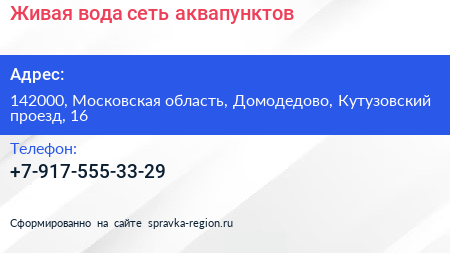 Живая вода, сеть аквапунктов по адресу 142000, Московская область, Домодедово, Кутузовский проезд, 16 в дальнейшем Организация, размещена в следующих категориях: