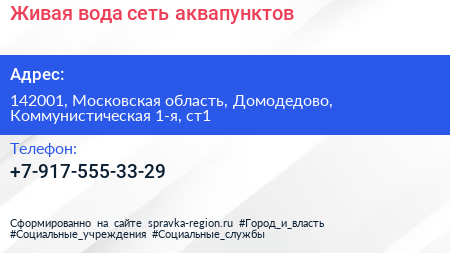 Живая вода, сеть аквапунктов по адресу 142001, Московская область, Домодедово, Коммунистическая 1-я, ст1 в дальнейшем Организация, размещена в следующих категориях: