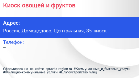 Киоск овощей и фруктов по адресу 34, Центральная улица, посёлок Государственного Племенного Завода "Константиново", городской округ Домодедово, Московская область, Центральный федеральный округ, 142029, Россия в дальнейшем Организация, размещена в следующих категориях: