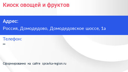 Киоск овощей и фруктов по адресу Домодедовское шоссе, посёлок Государственного Племенного Завода "Константиново", городской округ Домодедово, Московская область, Центральный федеральный округ, 142001, Россия в дальнейшем Организация, размещена в следующих категориях: