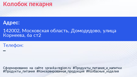 Колобок, пекарня по адресу 142002, Московская область, Домодедово, улица Корнеева, 6а ст2 в дальнейшем Организация, размещена в следующих категориях: