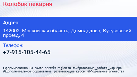 Колобок, пекарня по адресу 142002, Московская область, Домодедово, Кутузовский проезд, 4 в дальнейшем Организация, размещена в следующих категориях: