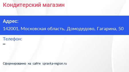 Кондитерский магазин по адресу 142001, Московская область, Домодедово, Гагарина, 50 в дальнейшем Организация, размещена в следующих категориях: