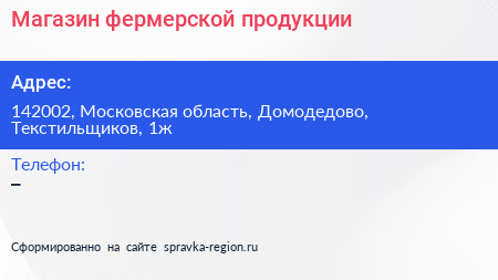 Магазин фермерской продукции по адресу 142002, Московская область, Домодедово, Текстильщиков, 1ж в дальнейшем Организация, размещена в следующих категориях: