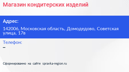 Магазин кондитерских изделий по адресу 142006, Московская область, Домодедово, Советская улица, 17в в дальнейшем Организация, размещена в следующих категориях: