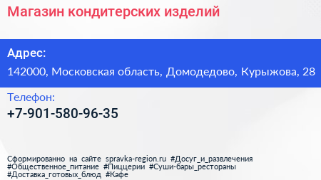 Магазин кондитерских изделий по адресу 142000, Московская область, Домодедово, Курыжова, 28 в дальнейшем Организация, размещена в следующих категориях: