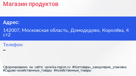 Магазин продуктов по адресу 142007, Московская область, Домодедово, Королёва, 4 ст2 в дальнейшем Организация, размещена в следующих категориях: