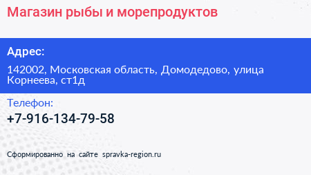 Магазин рыбы и морепродуктов по адресу 142002, Московская область, Домодедово, улица Корнеева, ст1д в дальнейшем Организация, размещена в следующих категориях: