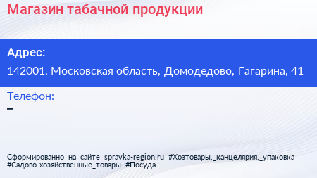 Магазин табачной продукции по адресу 142001, Московская область, Домодедово, Гагарина, 41 в дальнейшем Организация, размещена в следующих категориях: