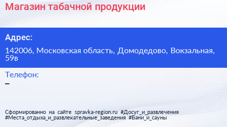Магазин табачной продукции по адресу 142006, Московская область, Домодедово, Вокзальная, 59в в дальнейшем Организация, размещена в следующих категориях:
