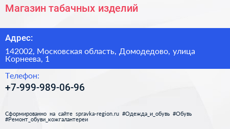 Магазин табачных изделий по адресу 142002, Московская область, Домодедово, улица Корнеева, 1 в дальнейшем Организация, размещена в следующих категориях: