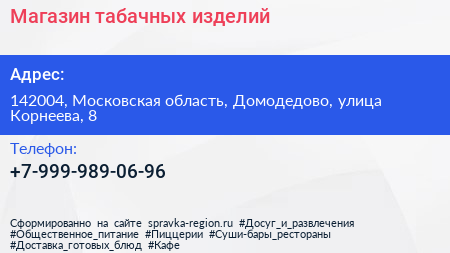 Магазин табачных изделий по адресу 142004, Московская область, Домодедово, улица Корнеева, 8 в дальнейшем Организация, размещена в следующих категориях: