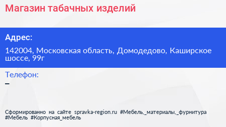 Магазин табачных изделий по адресу 142004, Московская область, Домодедово, Каширское шоссе, 99г в дальнейшем Организация, размещена в следующих категориях: