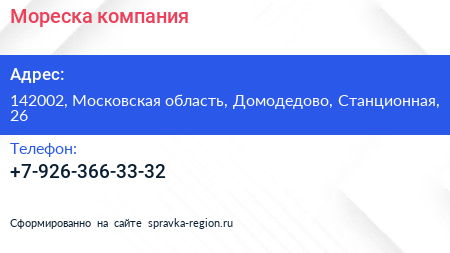 Мореска, компания по адресу 142002, Московская область, Домодедово, Станционная, 26 в дальнейшем Организация, размещена в следующих категориях:
