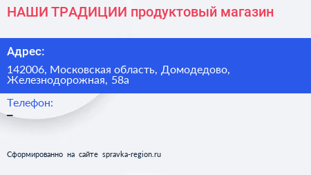 НАШИ ТРАДИЦИИ, продуктовый магазин по адресу 142006, Московская область, Домодедово, Железнодорожная, 58а в дальнейшем Организация, размещена в следующих категориях:
