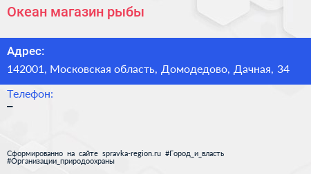 Океан, магазин рыбы по адресу 142001, Московская область, Домодедово, Дачная, 34 в дальнейшем Организация, размещена в следующих категориях: