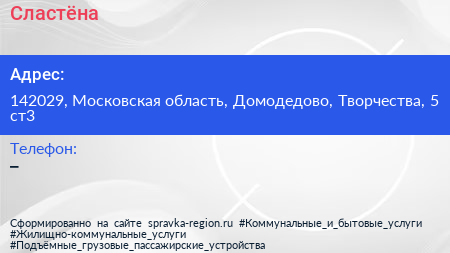 Сластёна по адресу 142029, Московская область, Домодедово, Творчества, 5 ст3 в дальнейшем Организация, размещена в следующих категориях: