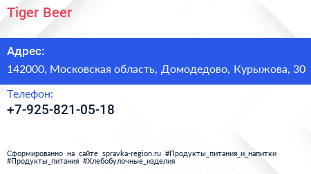 Tiger Beer по адресу 142000, Московская область, Домодедово, Курыжова, 30 в дальнейшем Организация, размещена в следующих категориях: