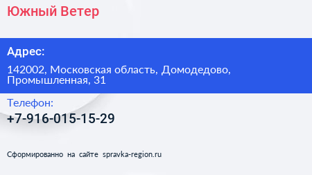 Южный Ветер по адресу 142002, Московская область, Домодедово, Промышленная, 31 в дальнейшем Организация, размещена в следующих категориях: