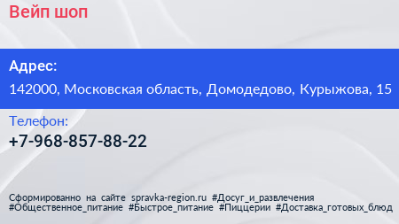 Вейп-шоп по адресу 142000, Московская область, Домодедово, Курыжова, 15 в дальнейшем Организация, размещена в следующих категориях: