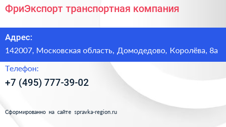 ФриЭкспорт, транспортная компания по адресу 142007, Московская область, Домодедово, Королёва, 8а в дальнейшем Организация, размещена в следующих категориях: