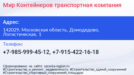Мир-Контейнеров, транспортная компания по адресу 142029, Московская область, Домодедово, Логистическая, 1 в дальнейшем Организация, размещена в следующих категориях: