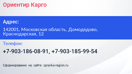 Ориентир Карго по адресу 142001, Московская область, Домодедово, Краснодарская, 12 в дальнейшем Организация, размещена в следующих категориях: