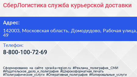 СберЛогистика, служба курьерской доставки по адресу 142003, Московская область, Домодедово, Рабочая улица, 49 в дальнейшем Организация, размещена в следующих категориях: