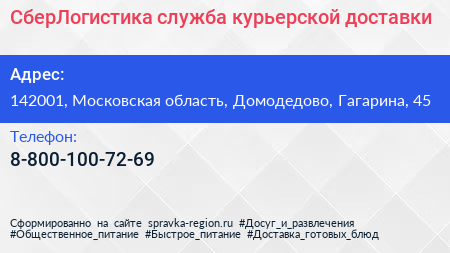 СберЛогистика, служба курьерской доставки по адресу 142001, Московская область, Домодедово, Гагарина, 45 в дальнейшем Организация, размещена в следующих категориях: