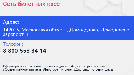 Сеть билетных касс по адресу 142015, Московская область, Домодедово, Домодедово аэропорт, 1 в дальнейшем Организация, размещена в следующих категориях: