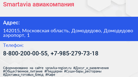 Smartavia, авиакомпания по адресу 142015, Московская область, Домодедово, Домодедово аэропорт, 1 в дальнейшем Организация, размещена в следующих категориях: