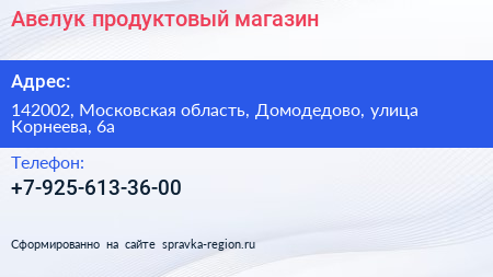 Авелук, продуктовый магазин по адресу 142002, Московская область, Домодедово, улица Корнеева, 6а в дальнейшем Организация, размещена в следующих категориях: