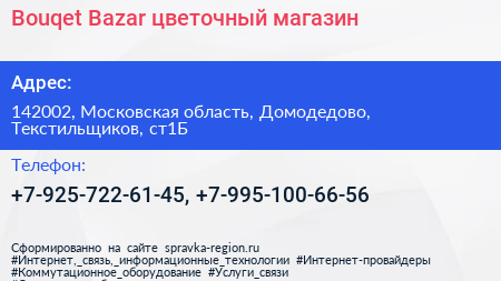 Bouqet Bazar, цветочный магазин по адресу 142002, Московская область, Домодедово, Текстильщиков, ст1Б в дальнейшем Организация, размещена в следующих категориях: