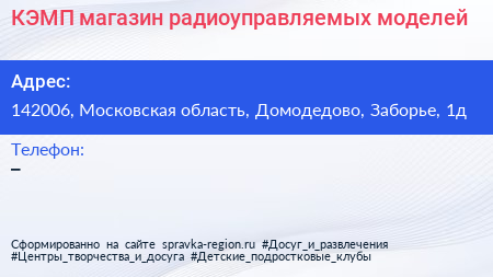КЭМП, магазин радиоуправляемых моделей по адресу 142006, Московская область, Домодедово, Заборье, 1д в дальнейшем Организация, размещена в следующих категориях: