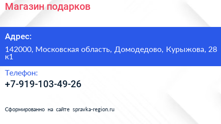 Магазин подарков по адресу 142000, Московская область, Домодедово, Курыжова, 28 к1 в дальнейшем Организация, размещена в следующих категориях: