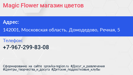 Magic Flower, магазин цветов по адресу 142001, Московская область, Домодедово, Речная, 5 в дальнейшем Организация, размещена в следующих категориях:
