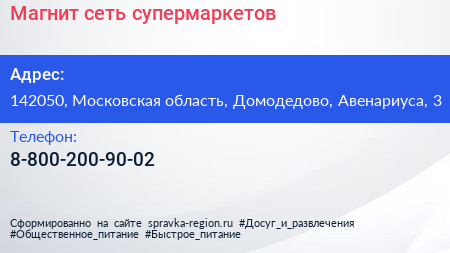 Магнит, сеть супермаркетов по адресу 142050, Московская область, Домодедово, Авенариуса, 3 в дальнейшем Организация, размещена в следующих категориях:
