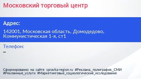 Московский, торговый центр по адресу 142001, Московская область, Домодедово, Коммунистическая 1-я, ст1 в дальнейшем Организация, размещена в следующих категориях: