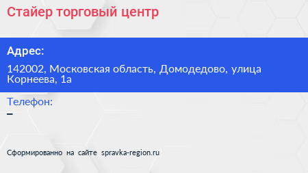Стайер, торговый центр по адресу 142002, Московская область, Домодедово, улица Корнеева, 1а в дальнейшем Организация, размещена в следующих категориях: