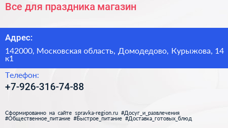 Все для праздника, магазин по адресу 142000, Московская область, Домодедово, Курыжова, 14 к1 в дальнейшем Организация, размещена в следующих категориях: