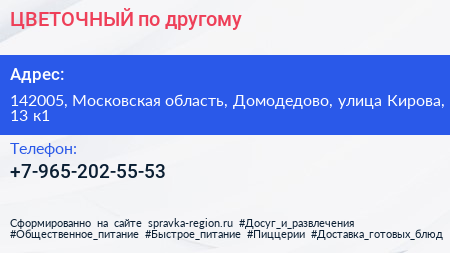 ЦВЕТОЧНЫЙ по-другому по адресу 142005, Московская область, Домодедово, улица Кирова, 13 к1 в дальнейшем Организация, размещена в следующих категориях: