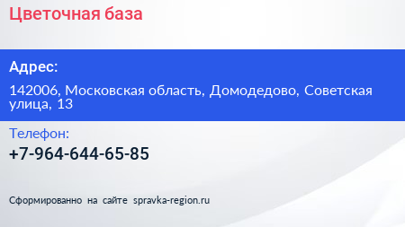 Цветочная база по адресу 142006, Московская область, Домодедово, Советская улица, 13 в дальнейшем Организация, размещена в следующих категориях: