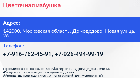 Цветочная избушка по адресу 142000, Московская область, Домодедово, Новая улица, 26 в дальнейшем Организация, размещена в следующих категориях: