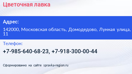 Цветочная лавка по адресу 142000, Московская область, Домодедово, Лунная улица, 11 в дальнейшем Организация, размещена в следующих категориях: